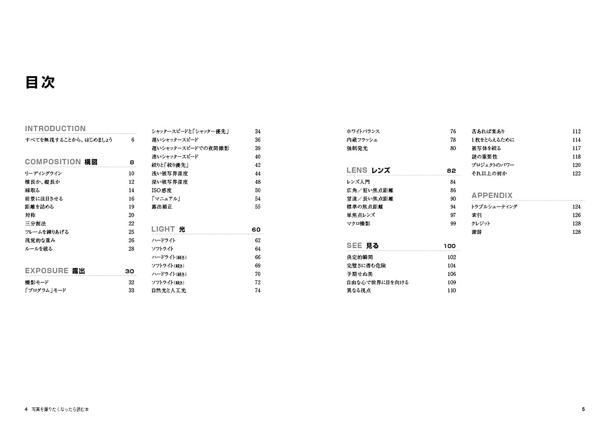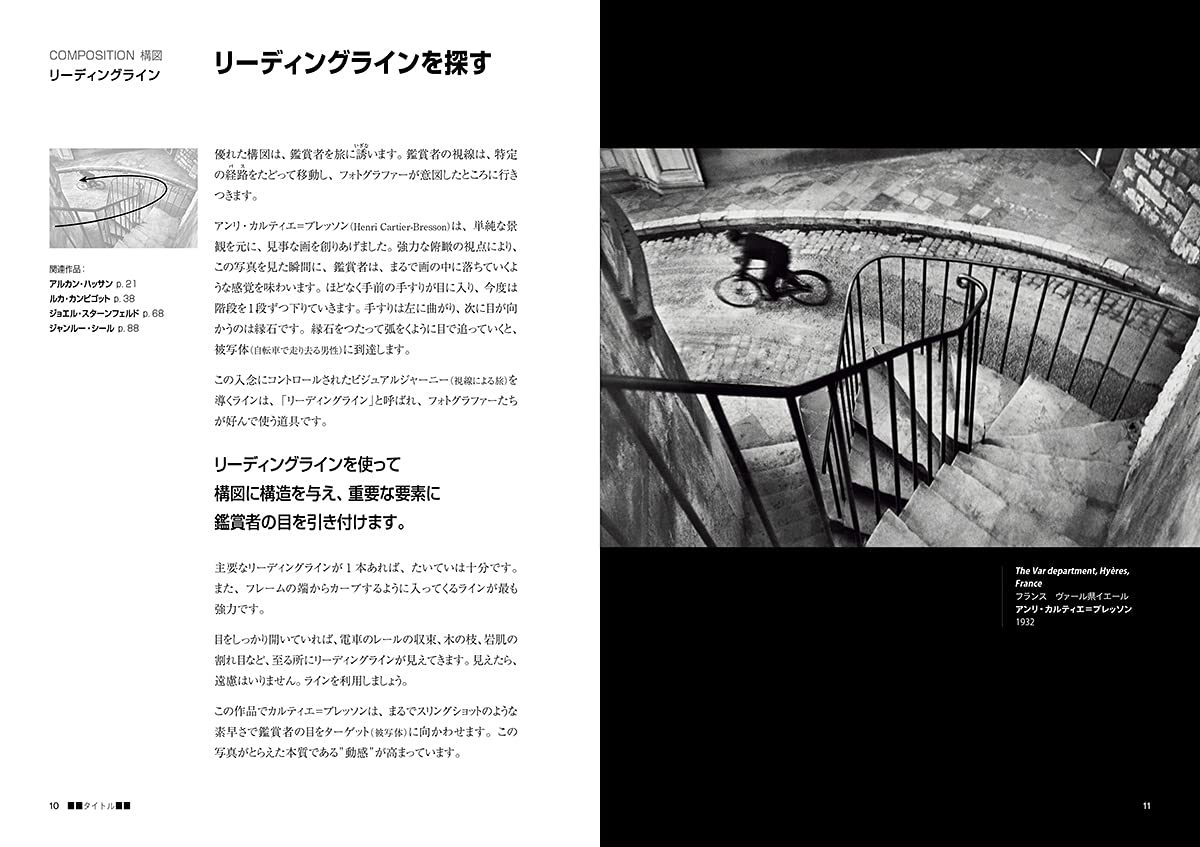 と「構図(11作品、10節)、露出(9作品、12節)、光(10作品、10節)、レンズ(9作品、6節)、見る(12作品、11節)」のメイン5章構成で巨匠の写真を通して、様々な知識や技術を説明している。