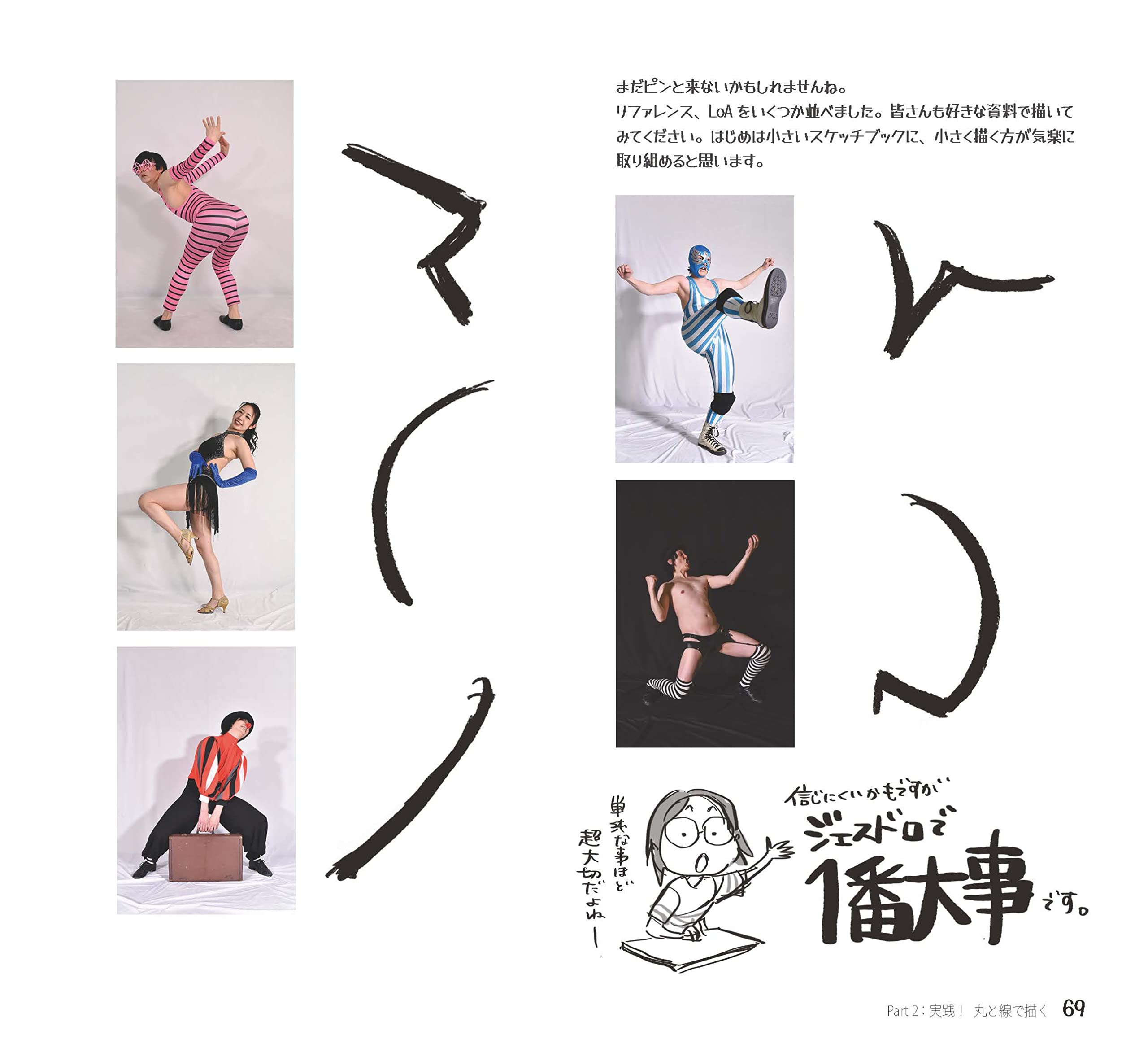 作者によるイラストやジェスチャードローイング図が、ほぼ全頁に展開。
