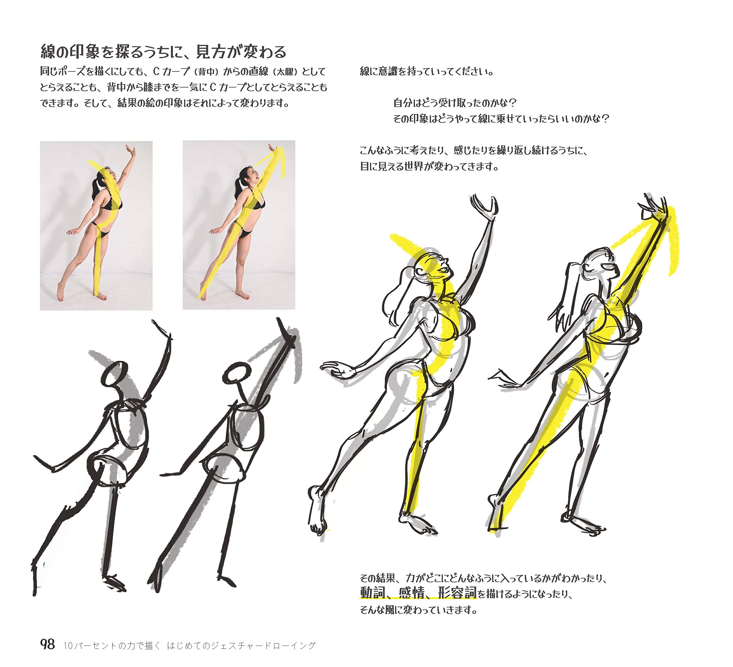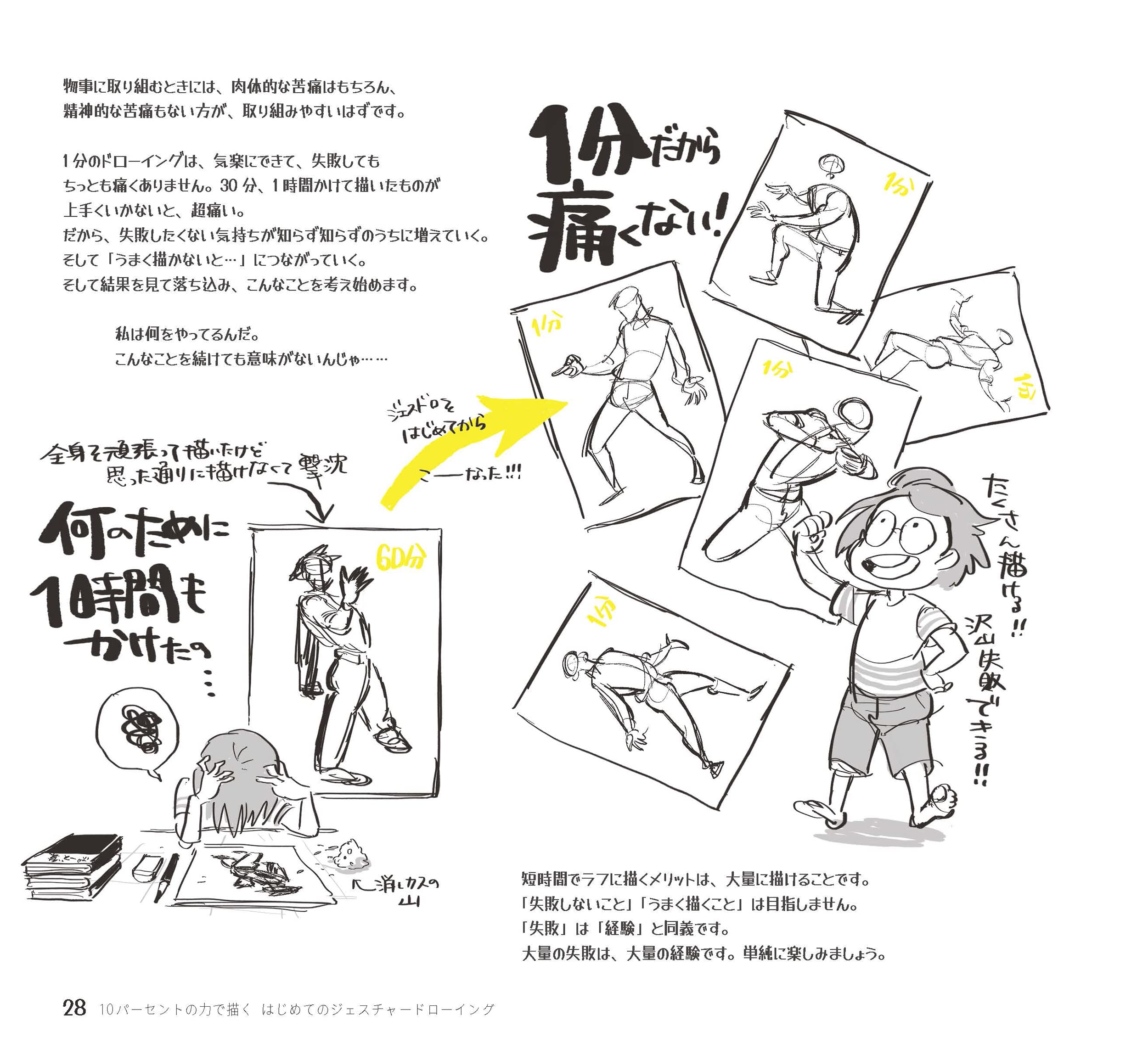 この気遣いの鬼とも言える姿勢が、初心者に向けたジェスチャードローイングの解説と上手く噛み合い、説明の切り口がどれも、優しく、分かりやすく、それでも分からなそうな人にも伝わる様に、更に、仮にダメだった人も気持ち良く本を閉じられる様に書かれている。