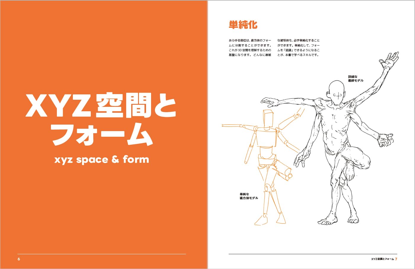 本書は、65頁目まで使って、重要なスキルとして、「XYZ空間とフォーム」「シルエット、輪郭線、プロポーション」「詳細度」「ボックスマネキン」「カメラと遠近法」と言う項目を作って、本編のレッスンで必要な前提を丁寧に解説してくれる。
