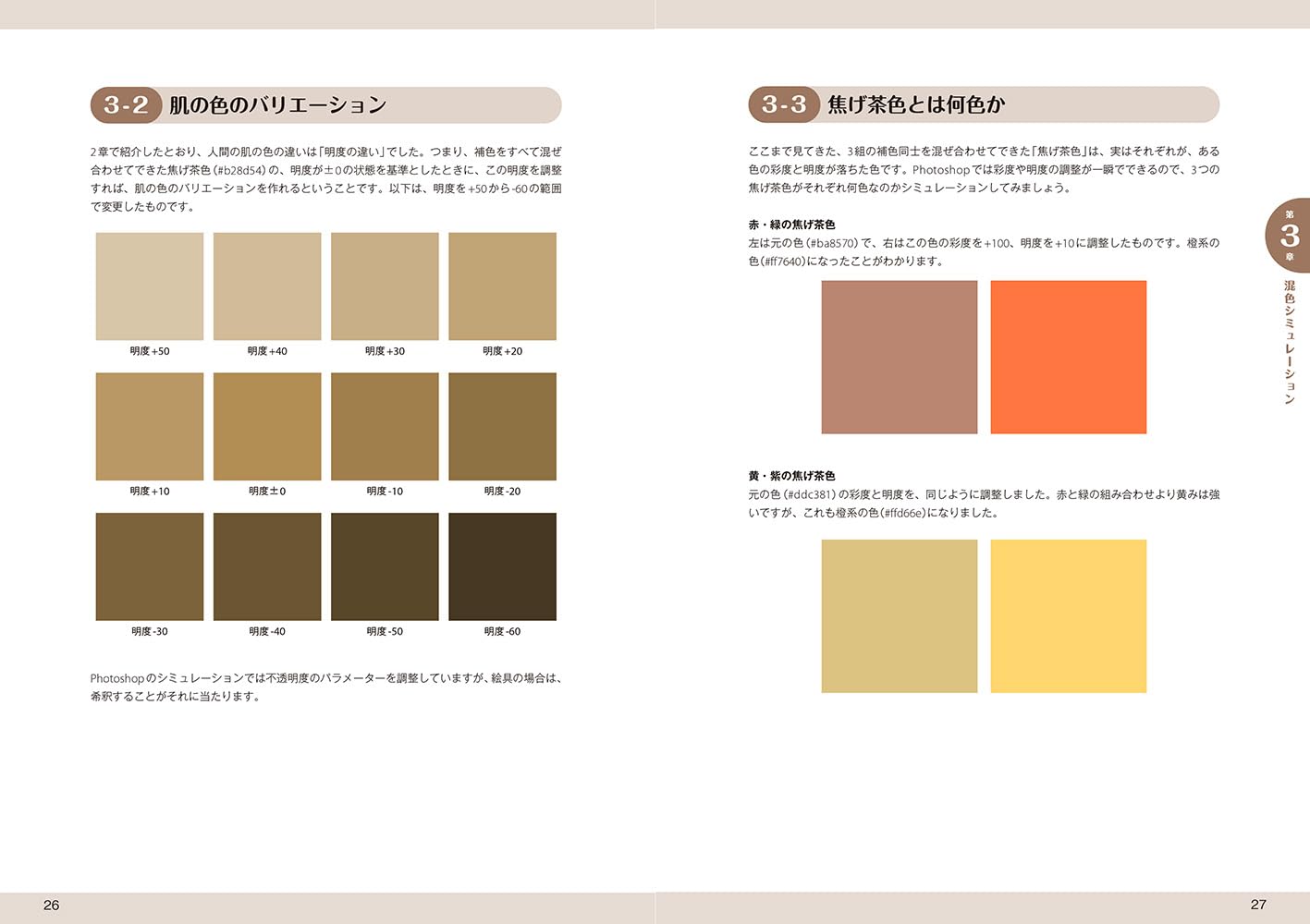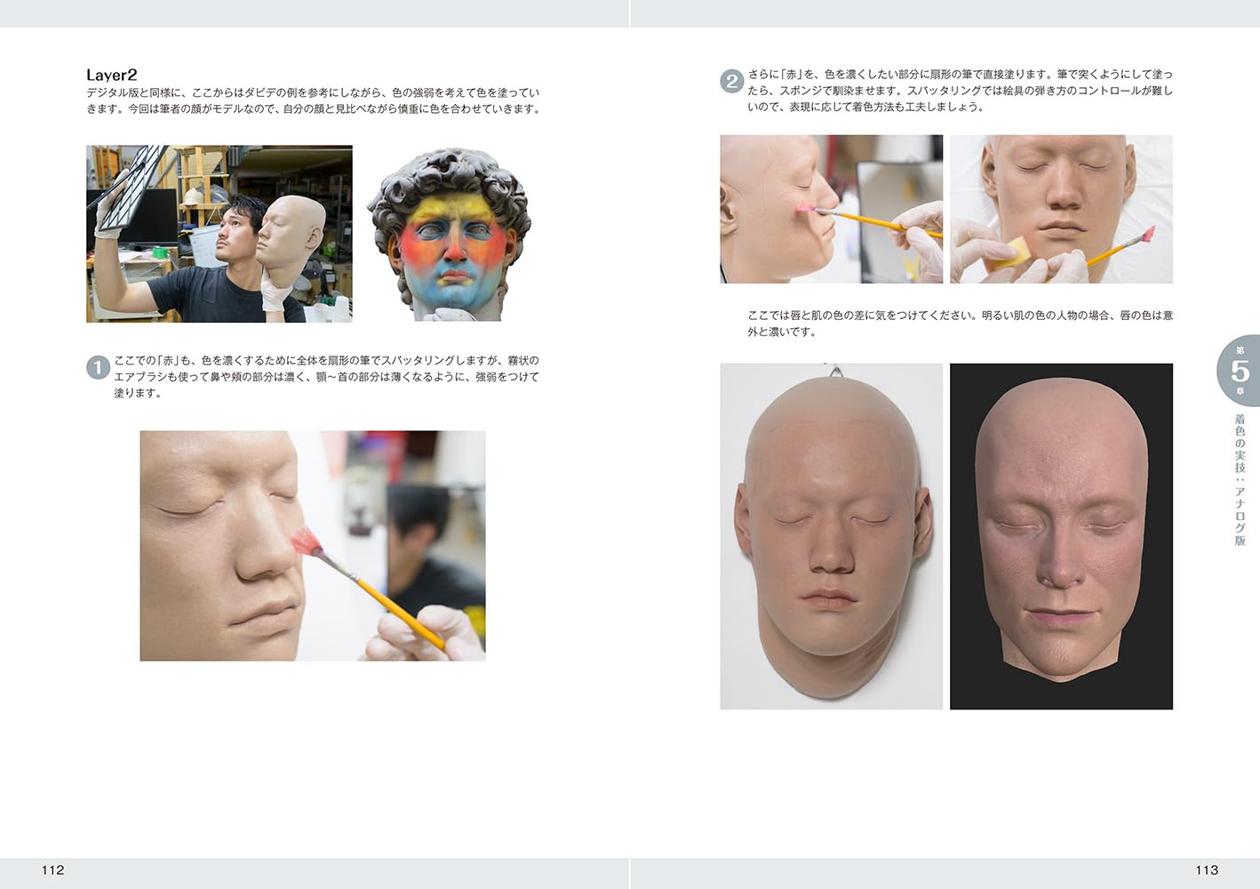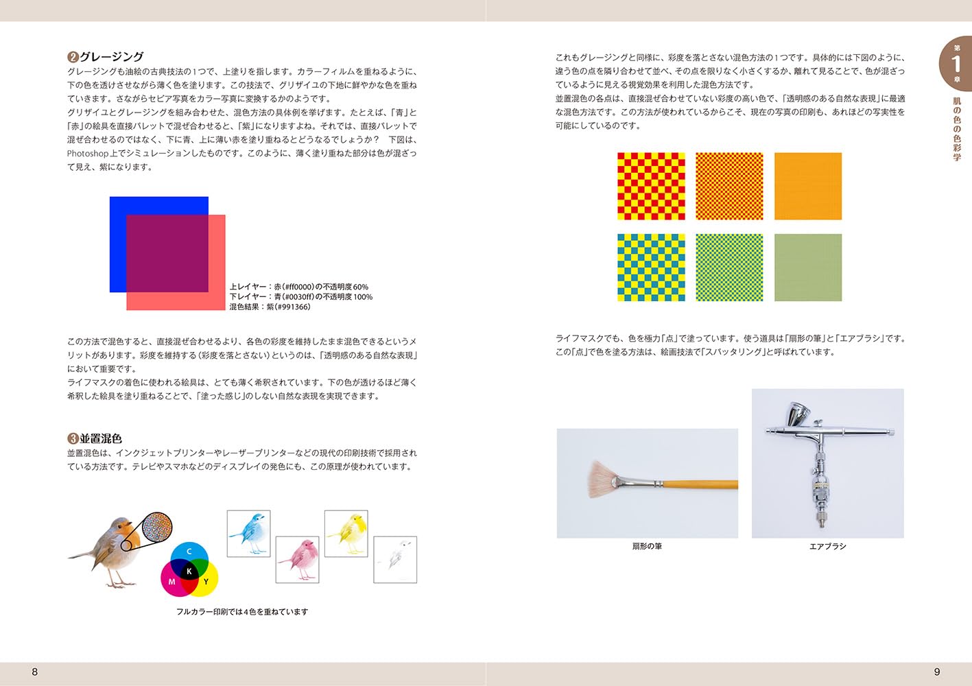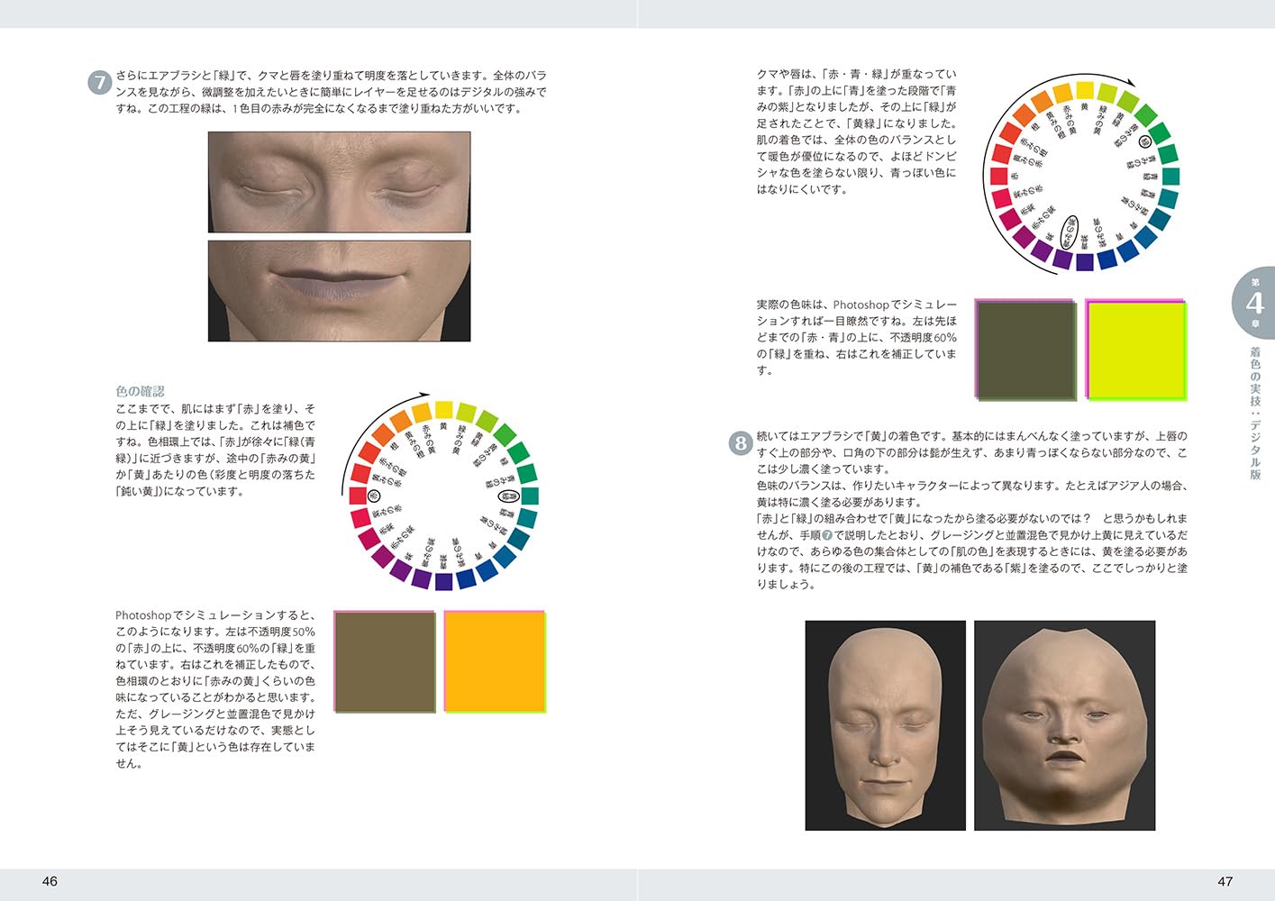 しかし本書では、グリザイユ、グレージング、並置混色、捕色対比、暖色・寒色・中性色、色彩学、科学的肌色の正体分析による色素と反射、虹彩、等までを考え抜いた上で、科学的に人の目が本物と誤認出来るリアリティを肌の塗りに乗せると言うアプローチが取られており、イメージするなら、CMYK4色で刷られた単色の色レイヤーを重ねる事で、フルカラー印刷の色を導き出すのに近い手法を、デジタルでもアナログでも、人力でやってしまおうに近い手法が紹介されている。